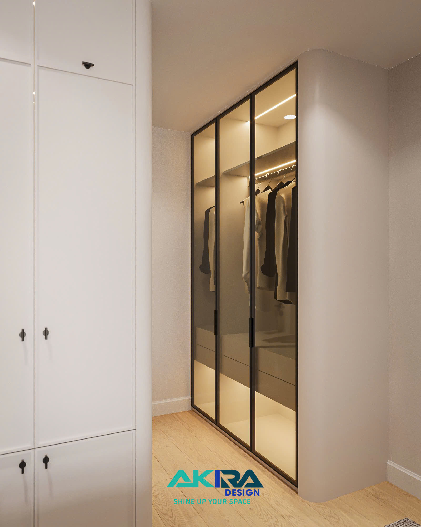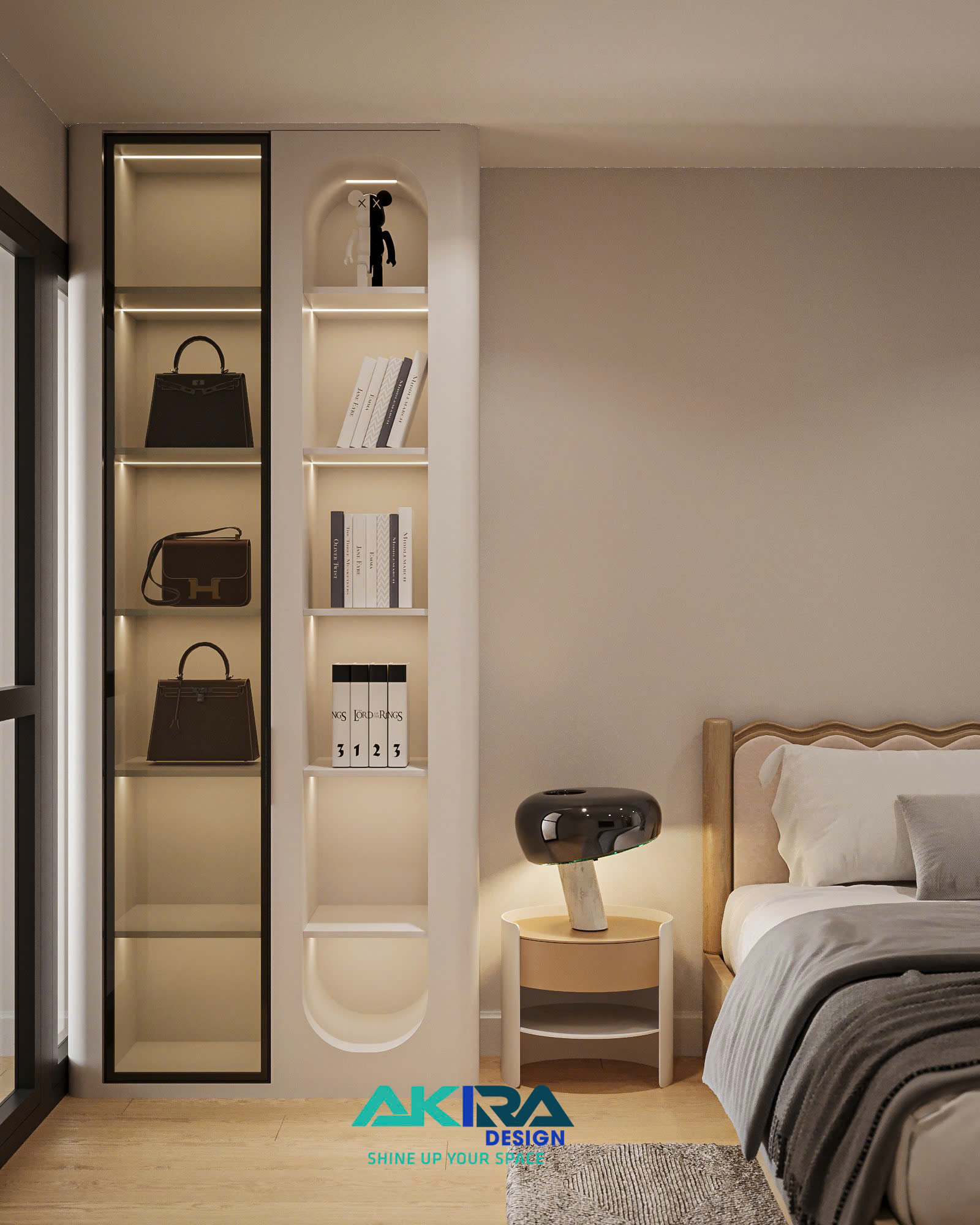 Akira Design đã tạo ra một điểm nhấn đặc biệt trong phòng ngủ với hệ kệ trang trí âm tường. Được chiếu sáng bằng hệ thống đèn LED hiện đại. Kệ không chỉ là nơi lưu trữ. Mà còn là góc trưng bày các vật dụng yêu thích của gia chủ như sách, túi xách, và các phụ kiện trang trí nhỏ xinh. Sự kết hợp giữa kệ mở và kệ kính tạo chiều sâu cho không gian. Đồng thời mang đến cảm giác tinh tế và hiện đại.